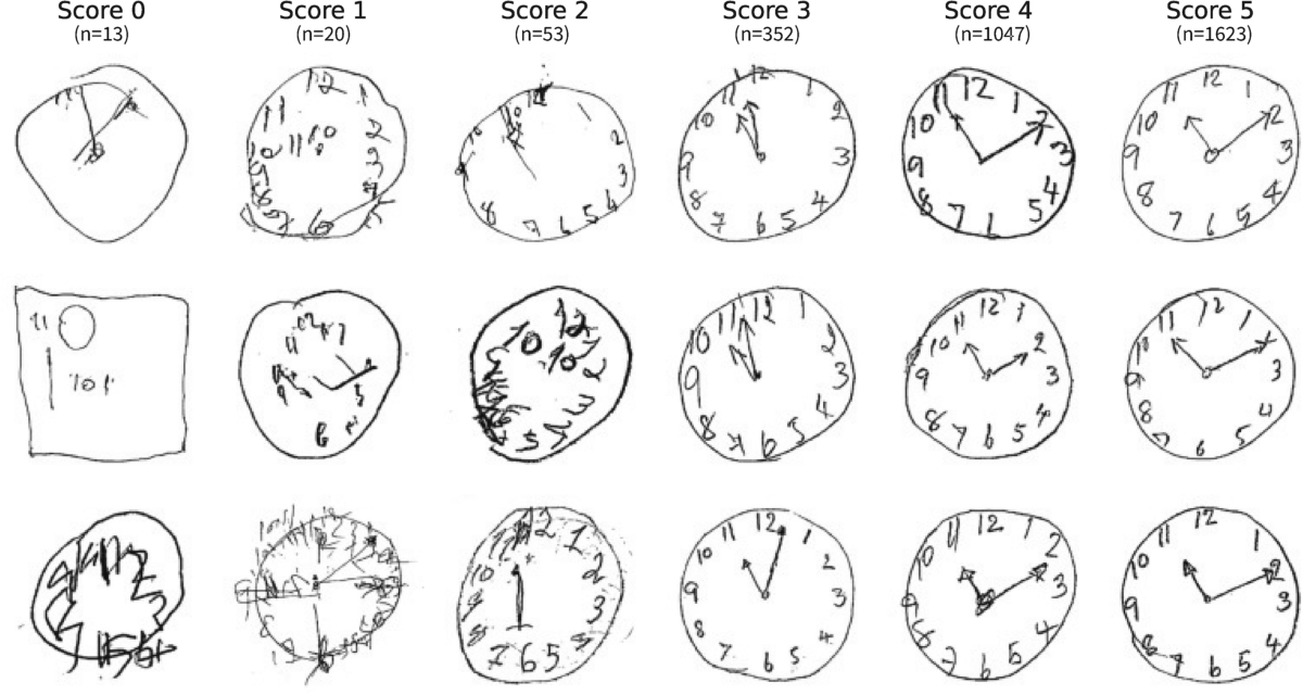 بیمارانی که زوال عقل آنها ناشی از بیماری پارکینسون یا هانتینگتون است، معمولاً ساعتی کوچکتر از حد معمول میکشند (کمتر از دو اینچ قطر). در مقابل، افرادی که به بیماری آلزایمر مبتلا هستند، تمایل دارند ساعتی بزرگتر بکشند (بیش از ۱۰ اینچ قطر).